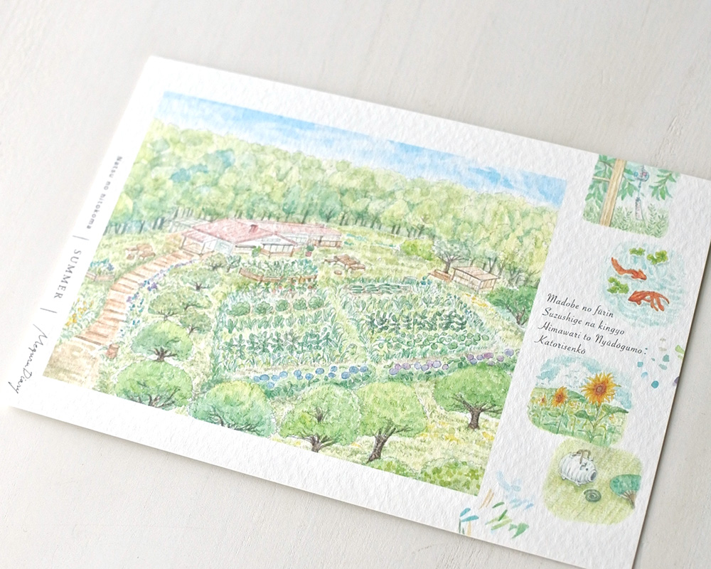 「窓辺の風鈴」「涼し気な金魚」など夏のワンシーンを添え、絵葉書のような雰囲気に仕上げています。