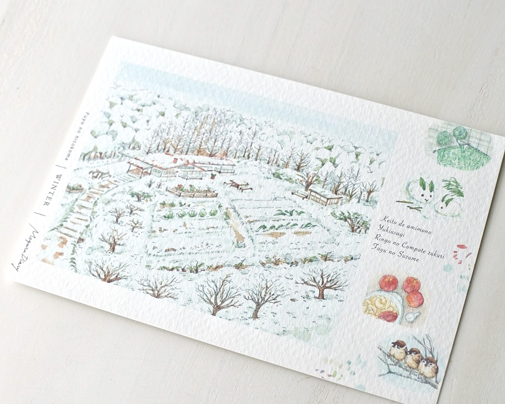 「毛糸で編み物」「冬のすずめ」など冬のワンシーンを添え、絵葉書のような雰囲気に仕上げています。