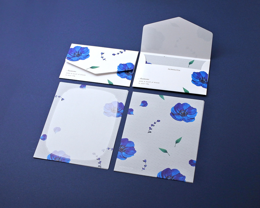 ミニ封筒はピュアホワイトと冴えたブルーのコントラストが映えるデザインに仕上げています。