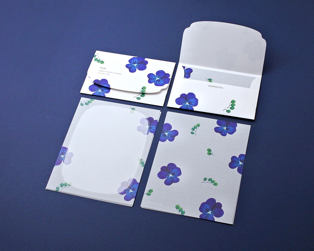 ミニ封筒はピュアホワイトと冴えたブルーのコントラストが映えるデザインに仕上げています。