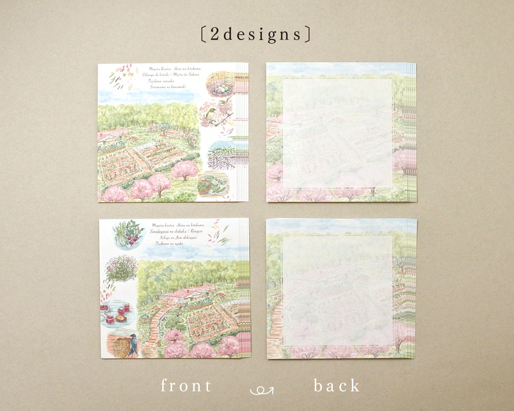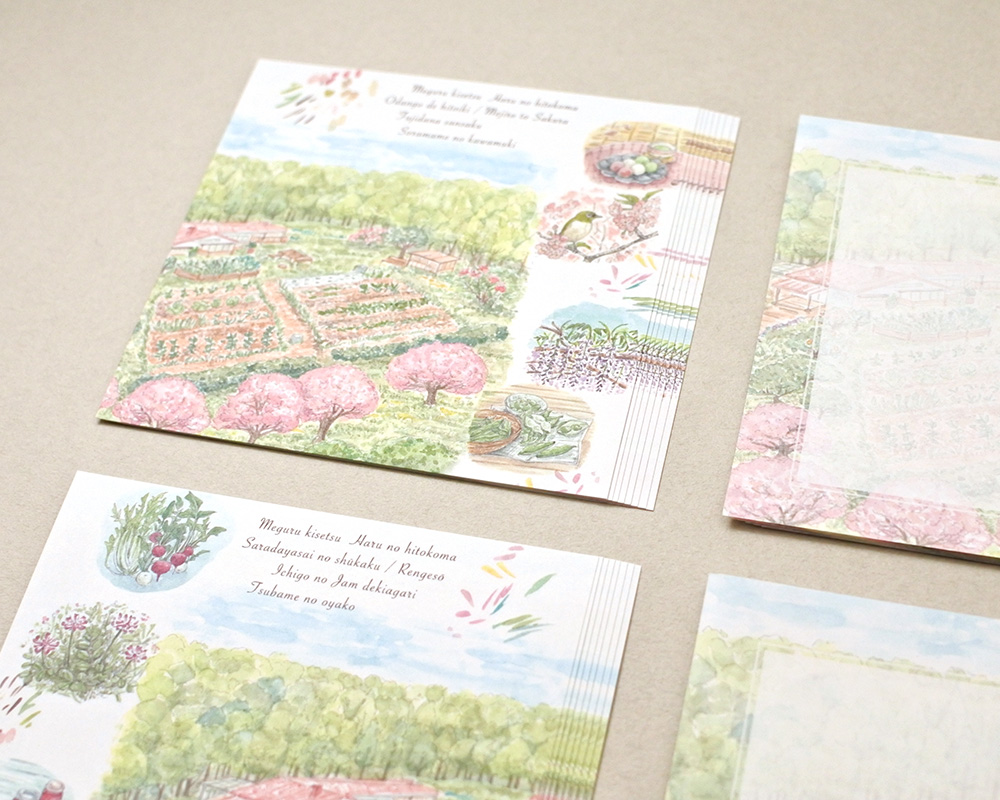メモ用紙の裏面にもうっすらと春の風景が入っていて、ひとことメッセージや、ちょっとしたお手紙に使うときなどにちょうどよいボリュームのサイズです。