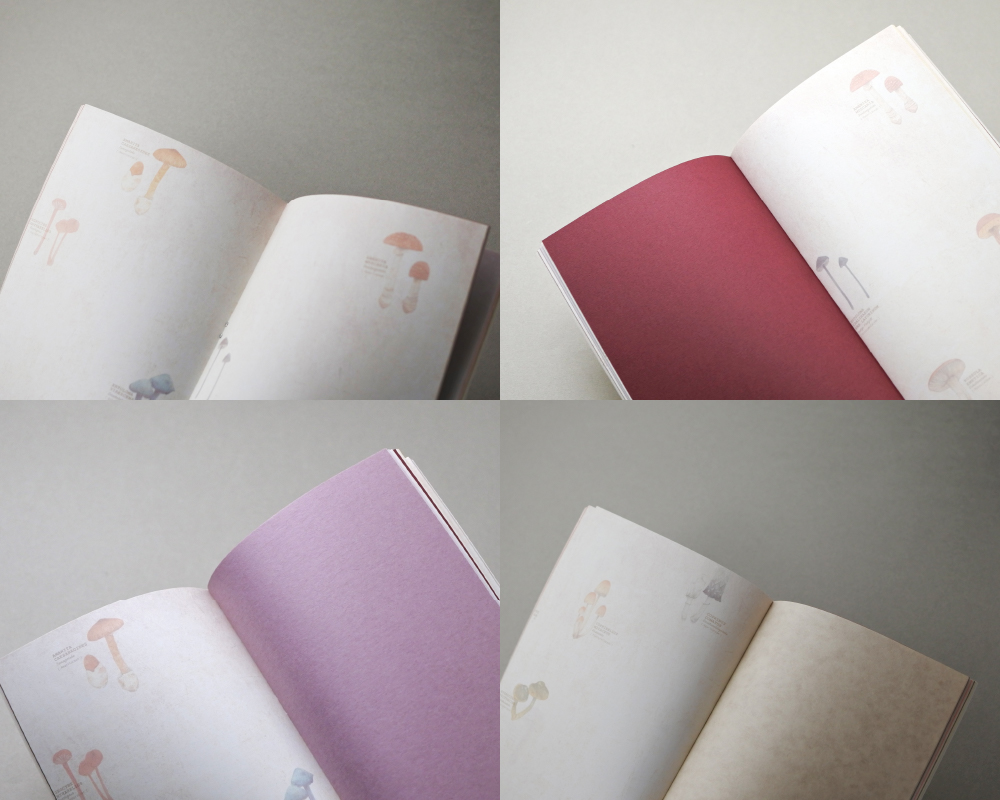 ページをめくると、きのこ柄や色紙、トレペなど色々な紙質や色合いの紙たちが綴じてあり、新しいアイデアをカタチにしたり、スクラップブックにしたり、コラージュしたり…と自由に使いたいときにぴったりなデザインノートです。